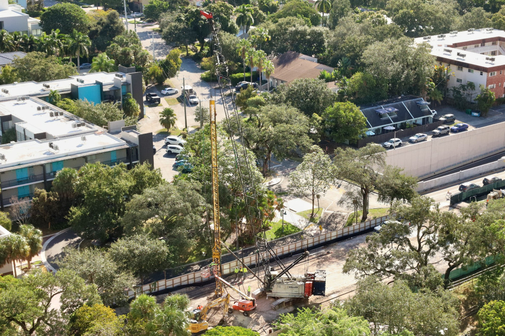 The site has been prepared for the building footprint, pilings have been drilled and filled, and work continues to set foundations for the construction cranes. Additional effort is focused on building out the footings and foundational elements, so expect the building to start going vertical in the coming weeks. Since the building is only eight stories, construction is planned for completion in 2026.